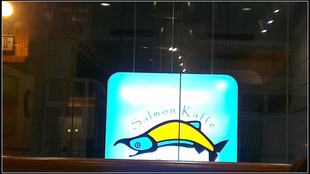 夜晚的鮭魚咖啡招牌被我拍得模糊了(哈